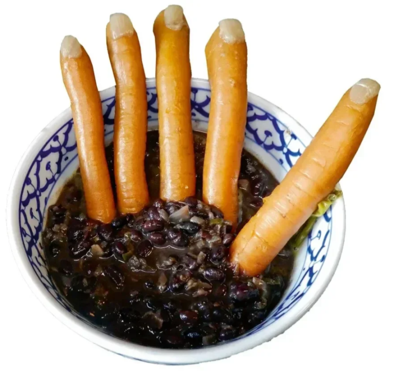 Anderzijds laat je vijf wortelen gaar koken in groentebouillon. Winterwortelen, die zien er meer uit als vingers. Als ze gaar zijn, snijd je ze netjes door zodat ze kunnen blijven rechtstaan. Versier de top van elke wortel met een puntig gesneden stukje van de rok van een ajuin, dat moet scherpe nagels voorstellen. Voor het opdienen doe je de bonen in een kom en steek je de wortelen in de bonenmassa, alsof er een griezelige hand uit de bonenschotel steekt.